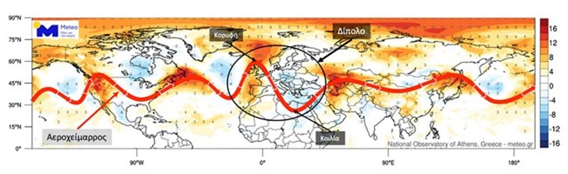 Ο επόμενος Χάρτης δείχνει την απόκλιση της θερμοκρασίας από τα κανονικά επίπεδα στα χαμηλά στρώματα της ατμόσφαιρας και τη θέση του πολικού αεροχειμάρρου (κόκκινη καμπύλη). Όπως διακρίνεται, τα πλανητικά ατμοφαιρικά κύματα που δημιουργούνται συνδέονται άμεσα με την μεταφορά θερμών (κορυφές κυμάτων) και ψυχρών αερίων μαζών (κοιλίες).