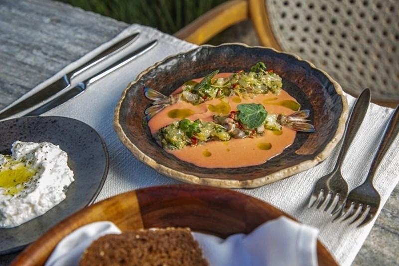 Ξεκινήσαμε με ταρτάρ από ελληνικές γαρίδες, φράουλες, βασιλικό και καυτερές πιπεριές Κρήτης, πρώτο πιάτο που συνδύαζε εξαιρετικά την δροσιά με μία ελαφριά καψάδα, η οποία έδωσε το απαραίτητο edge χωρίς να μας προκαλέσει δυσφορία (είχαμε και καύσωνα).