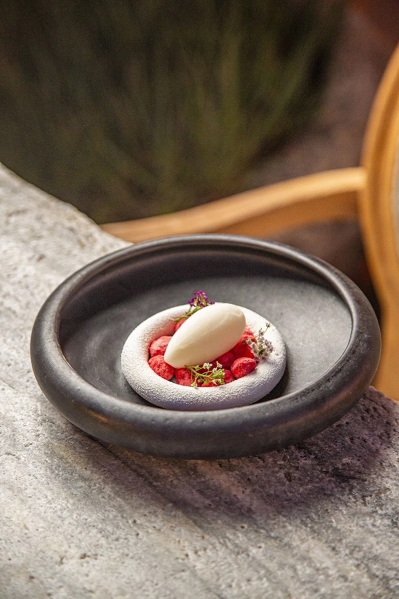 Το φινάλε δε θα μπορούσε να μην είναι φαντασμαγορικό, με επιδόρπιο ένα παρφέ γιαουρτιού με μάντολες Κεφαλονιάς, ένα παιχνιδιάρικο εύρημα και ένα δροσερό αποτέλεσμα με πολλαπλές γεύσεις να ‘παλεύουν’ για κυριαρχία σε κάθε μπουκιά.