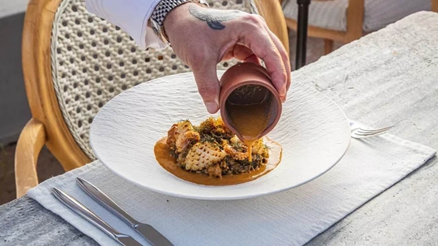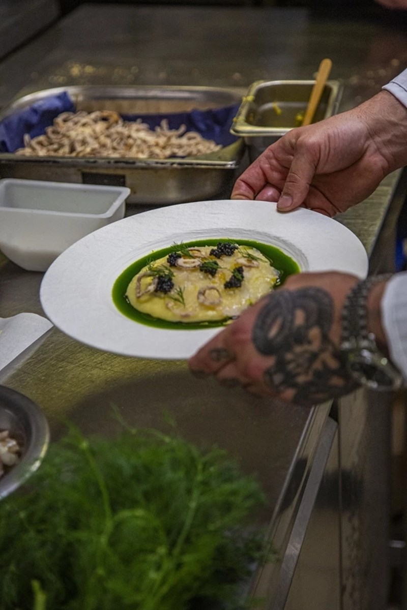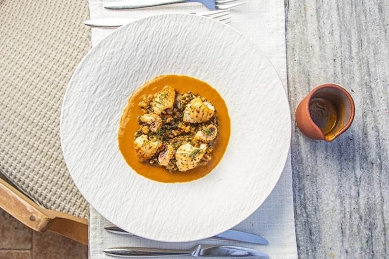 Η άλλη επιλογή κυρίως πιάτου ήταν σουπιά με τσιγαρίδια, άγρια χόρτα, πουρατζίνο και ντομάτα, με νοσταλγικές γεύσεις που ταξίδεψαν στο σήμερα μέσα από φαντασία και προσοχή στην λεπτομέρεια.